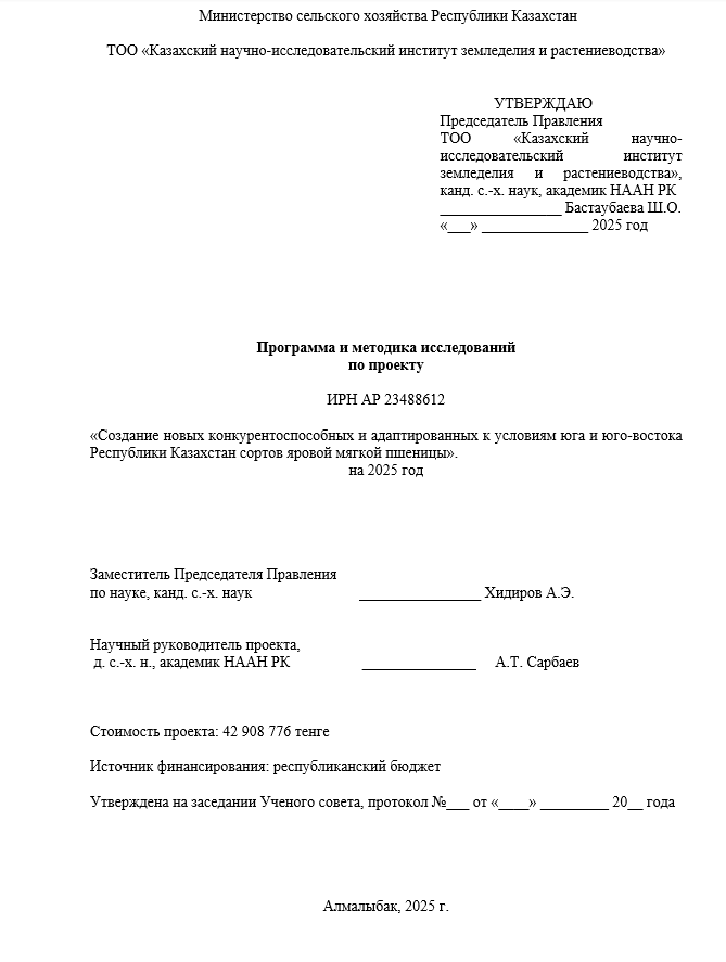 | 6 | Испытание перспективных номеров яровой мягкой пшеницы в сельхозформированиях Алматинской области и выденние лушчих из них | Март 2025 г | Июль 2025 г | Будут проведены испытания перспективных номеров яровой мягкой пшеницы в сельхозформированиях Алматинской области и выделение лучших из них. Будут выделены лучшие номера яровой мягкой пшеницы производственных условиях. |